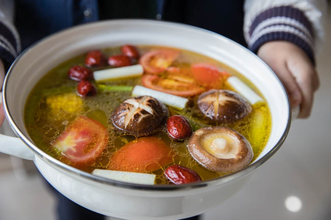 - In your serving pot, add tomatoes, 2-3 shiitake mushrooms, red dates, scallion sections, celery and 3 sections of corns. Season with 2 teaspoons of salt and load with 3 L light stock.